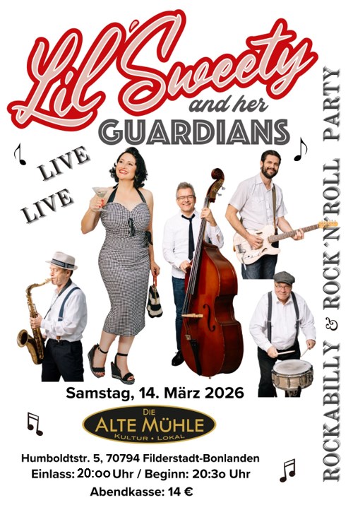 Lil´Sweety and her Guardians entführen den Zuhörer mit großer Spielfreude und einem abwechslungsreichen Programm in die Ära des Rock´n´Roll und Rockabilly der 50er Jahre. Songs der Wild Women des Rockabilly wie Janis Martin und Wanda Jackson, wie Original Rock´n´ Roll von Little Richard und Bill Haley, sowie Rhythm and Blues von La Vern Baker und Ben E. King bis hin zu einem deutschen Twist von Caterina Valente werden von Lil´Sweety mit starker Stimme und Soul interpretiert. Die erfahrenen Musiker sind Meister ihres Fachs und grooven und rocken bis auch der letzte Zuschauer die Hüften schwingt. Es darf geboppt und gestrollt werden. Let the good times roll!